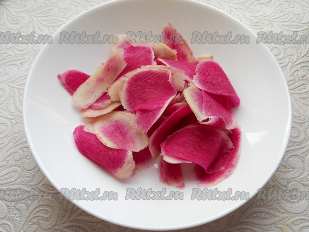 Нарезать редьку с помощью овощечистки на тонкие слайсы.