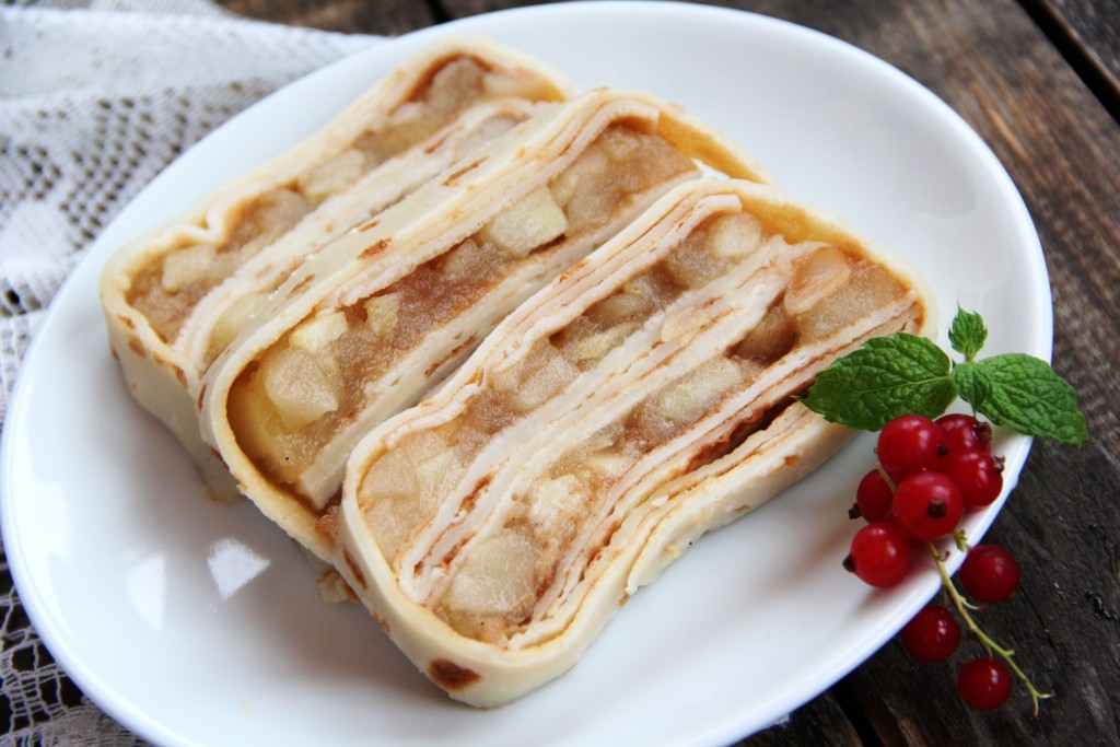 Нарезать наивкуснейший блинный торт с яблочной начинкой на кусочки и подать к столу, по желанию, можно украсить свежими ягодами.