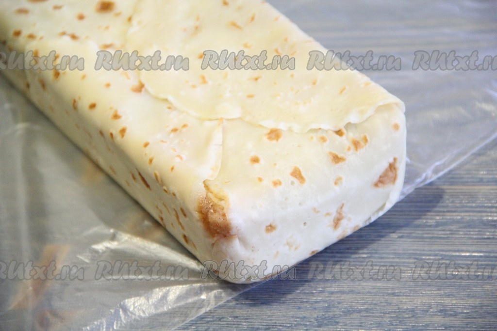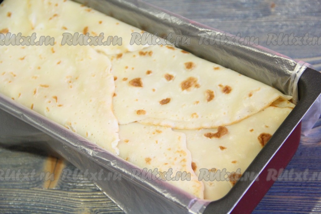Прямоугольную форму для выпекания кексов или хлеба выстелить пищевой плёнкой так, чтобы края плёнки свисали с двух сторон формы (в конце приготовления свисающей плёнкой будем накрывать торт). Затем выложить блинчики внахлёст, края блинов должны свисать с формы (у меня ушло 4 блина плюс 1 блин на края). На дно формы выложить пару блинчиков, разрезанных пополам.