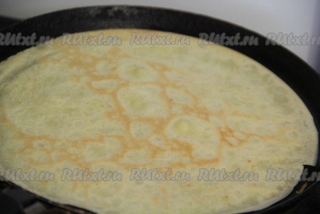 Сковороду смазать растительным маслом, раскалить её, налить половник теста и жарить блинчик на среднем огне с двух сторон до подрумянивания, затем переложить на тарелку. Тесто нужно периодически перемешивать. Постепенно пожарить все блины. Сковороду смазывать маслом по мере необходимости (я после выпечки первого блина сковороду больше маслом не смазываю, так как масло есть в составе теста).