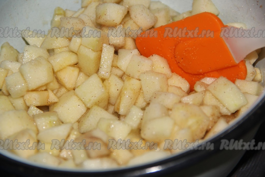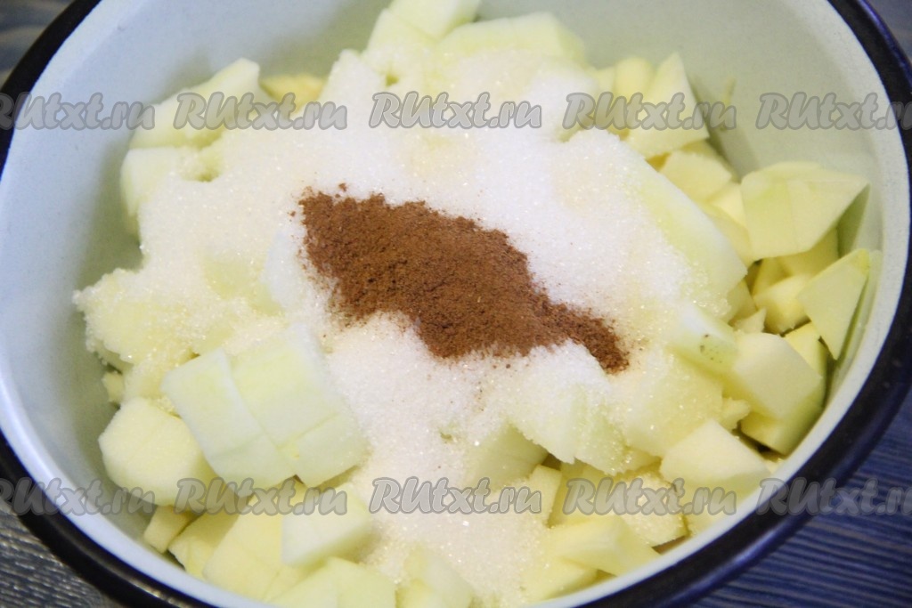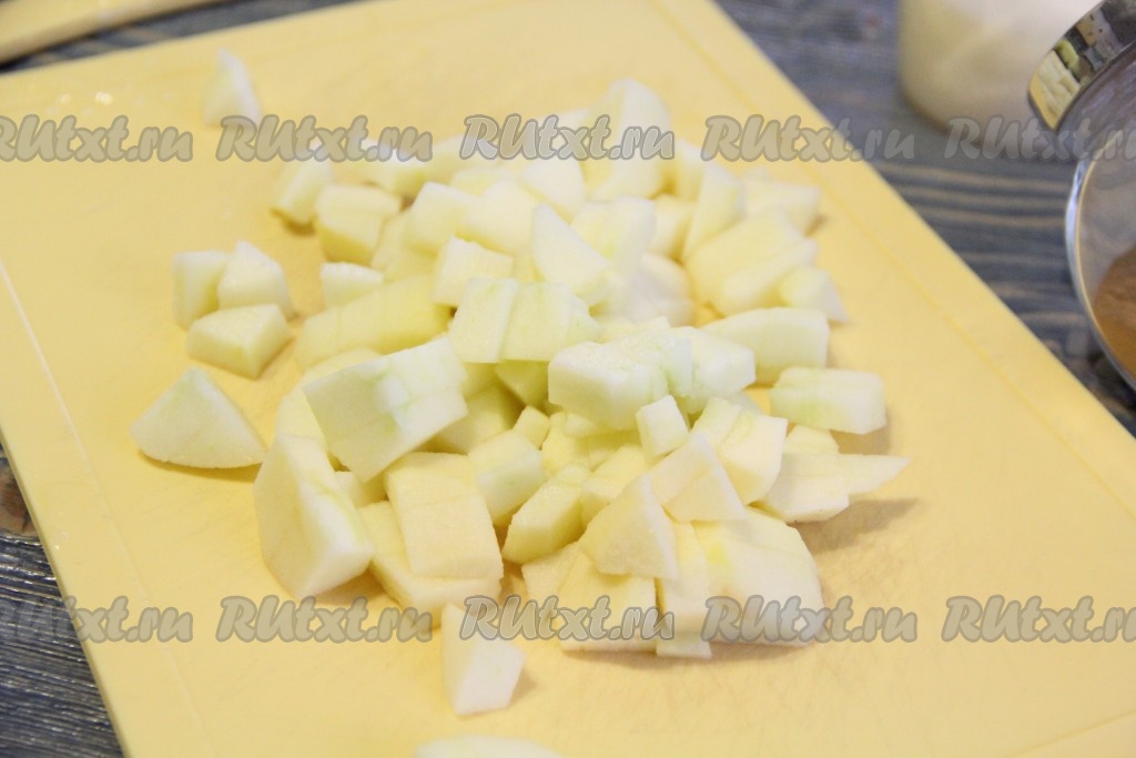 Для приготовления начинки яблоки вымыть, очистить от кожуры и семян. Нарезать яблоки на средние кубики.