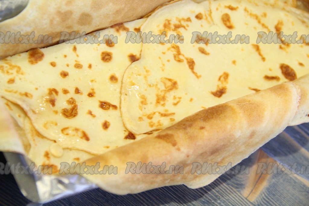 Накрыть начинку блинами, разрезанными на две части (можно использовать 2-3 блина).