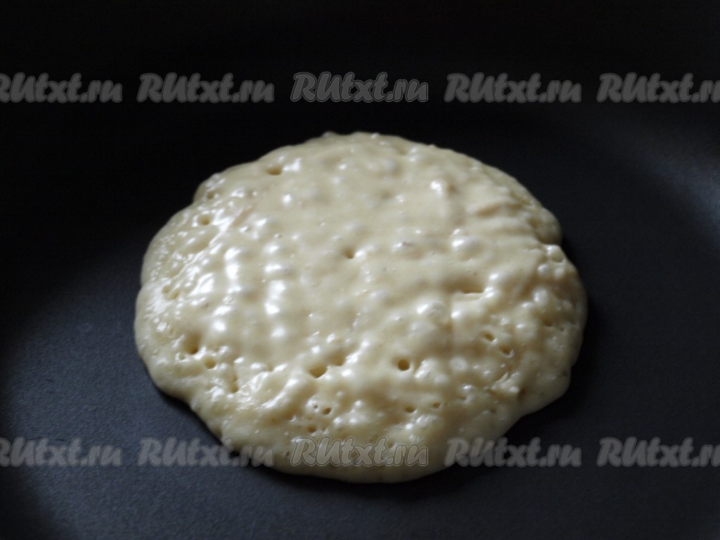 Выкладывать в центр хорошо разогретой сухой сковороды по 3 столовые ложки теста. Когда поверхность покроется порами, яблочный панкейк перевернуть.