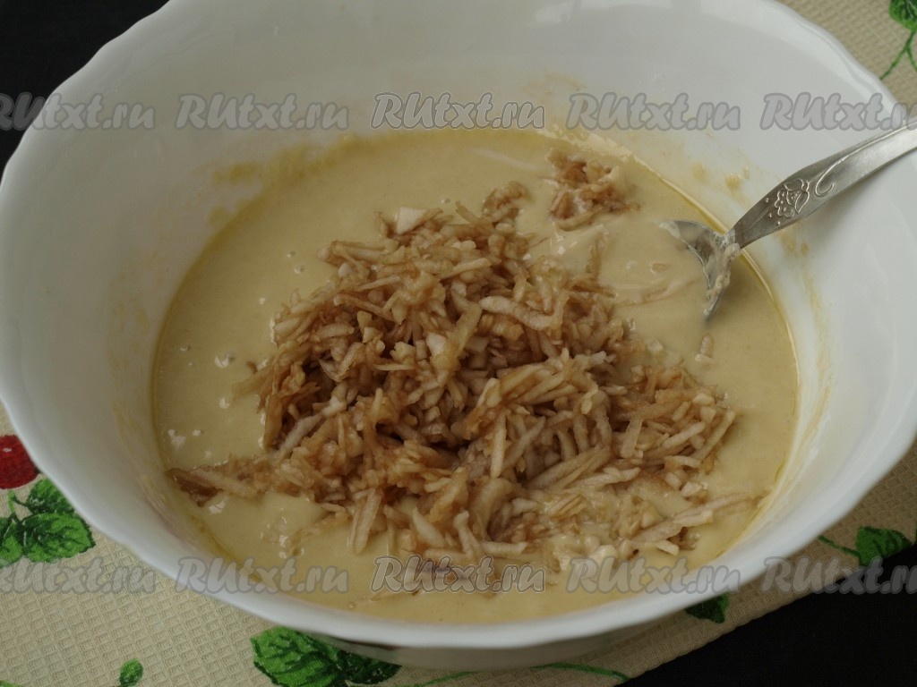 В тесто просеять муку с разрыхлителем. Перемешать ложкой, затем влить оставшееся молоко и подсолнечное масло. Яблоко очистить от кожуры и натереть мякоть на средней тёрке. Мякоть яблок добавить в тесто, перемешать. Тесто получится, как густая сметана.