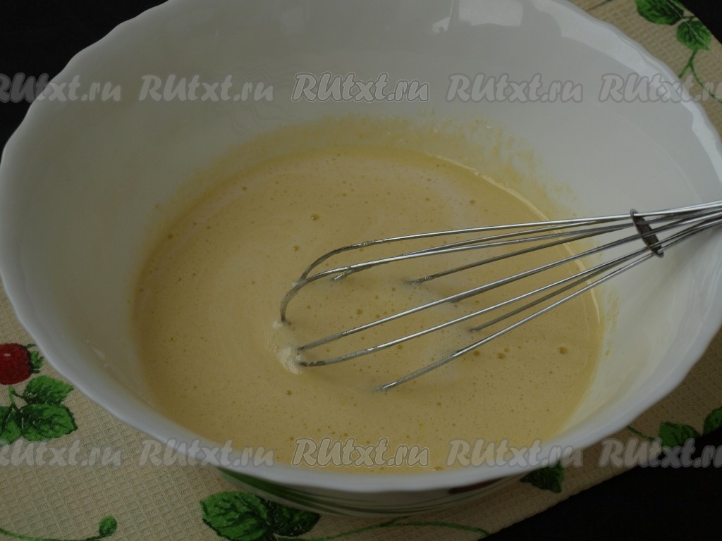 Влить в яичную массу 150 мл молока и продолжить взбивать.