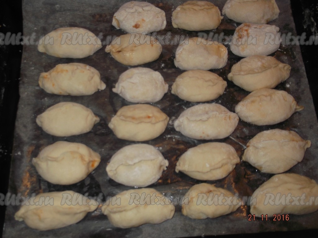 Выложить пирожки с яблочно-тыквенной начинкой на застеленный пекарской бумагой противень на расстоянии друг от друга.
