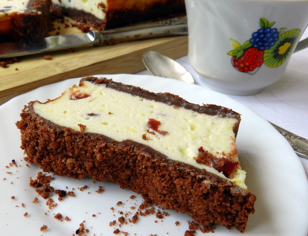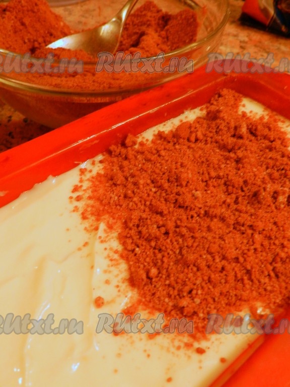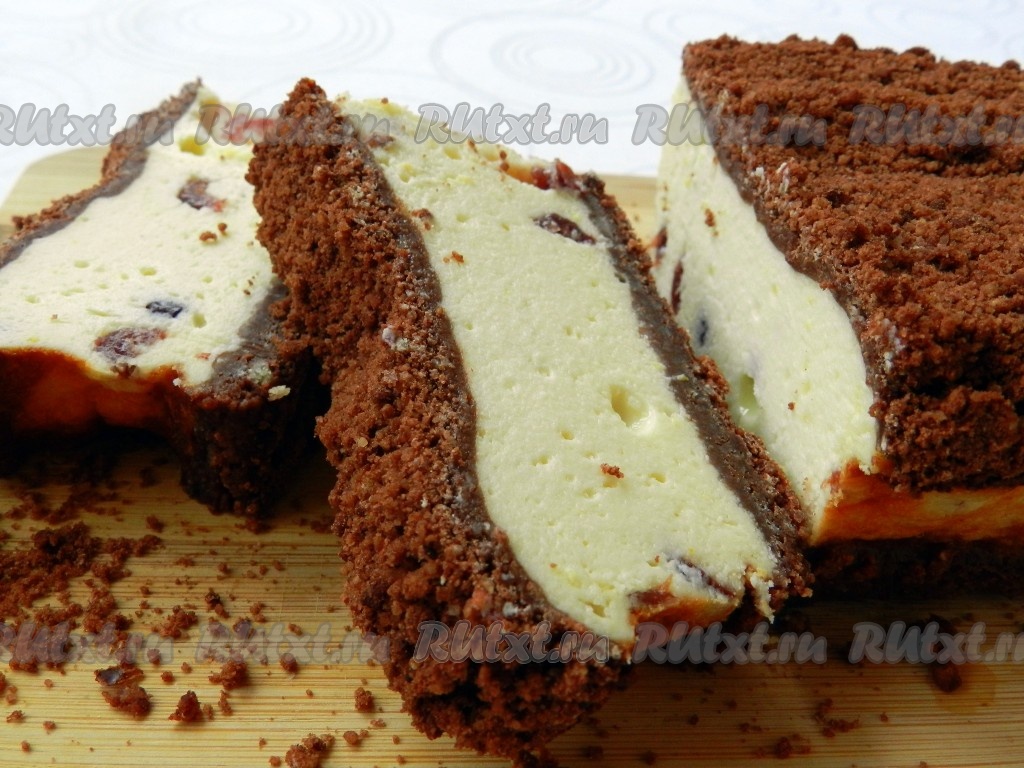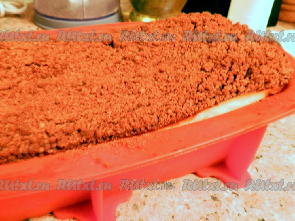 На дно формы для запекания выложить половину шоколадного штрейзеля, затем творожную массу, тщательно разровнять лопаткой, чтобы не было пустот.