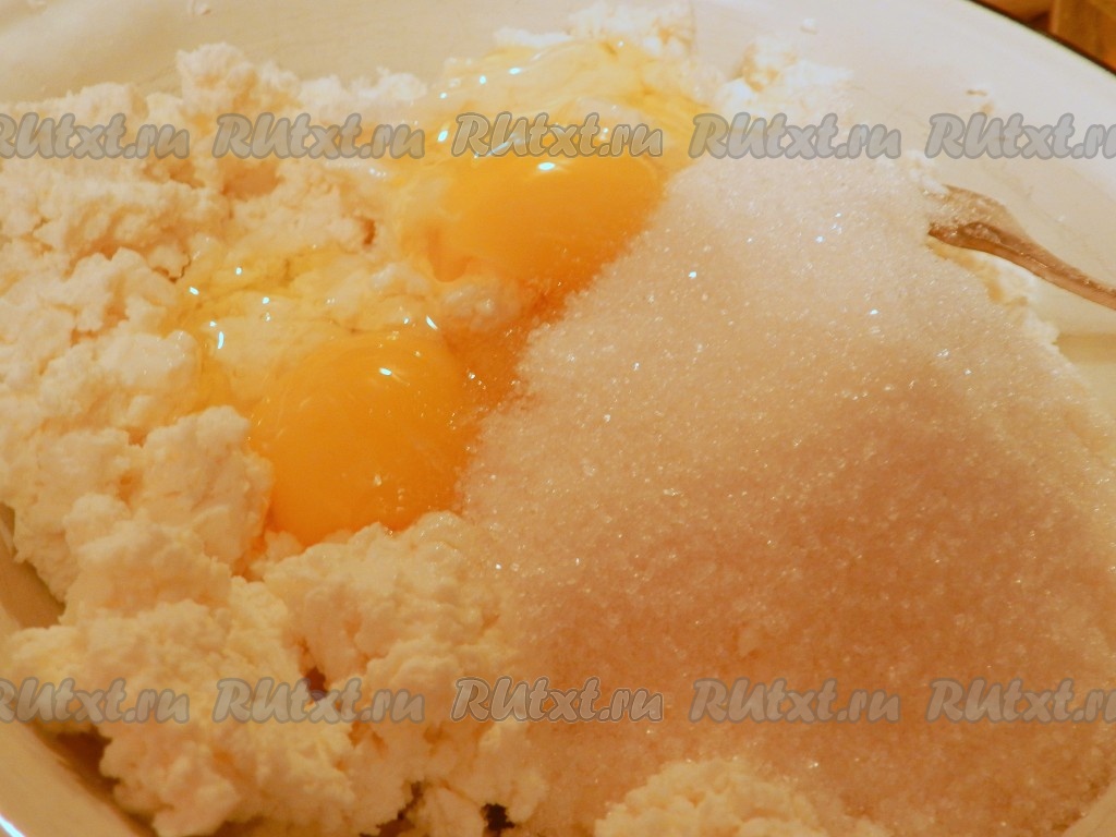 Творог, сахар, яйца выложить в одну посуду.