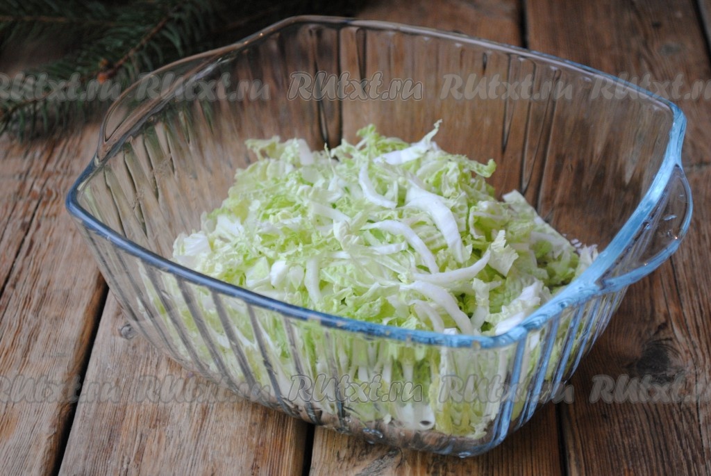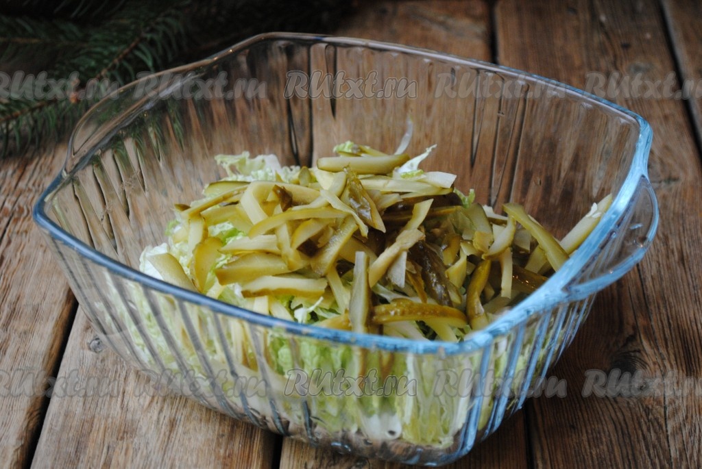 Солёные (или маринованные) огурцы нарезать соломкой и выложить к пекинской капусте.