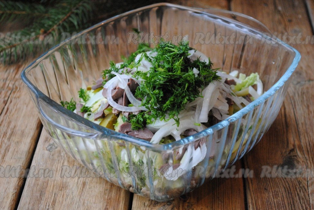 Очень вкусный салат с куриными сердечками и солеными огурцами готов, раскладываем его по салатницам и подаём к столу.