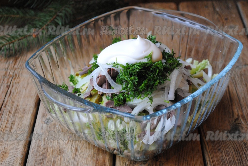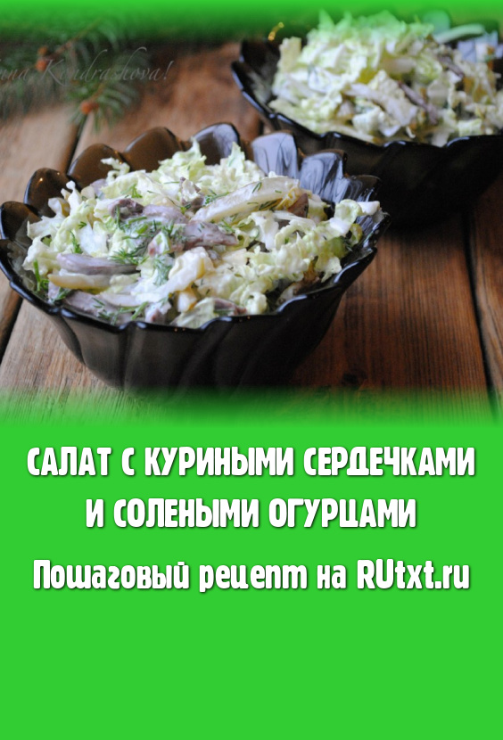 Простой салат с куриными сердечками и солеными огурцами, приготовленный по этому рецепту, получается очень вкусным. В его состав входит пекинская капуста, которая делает блюдо достаточно нежным на вкус. Попробуйте! Такой салат можно готовить и в будни, и в праздники. Заправить его можно сметаной или майонезом, как я это сделала.