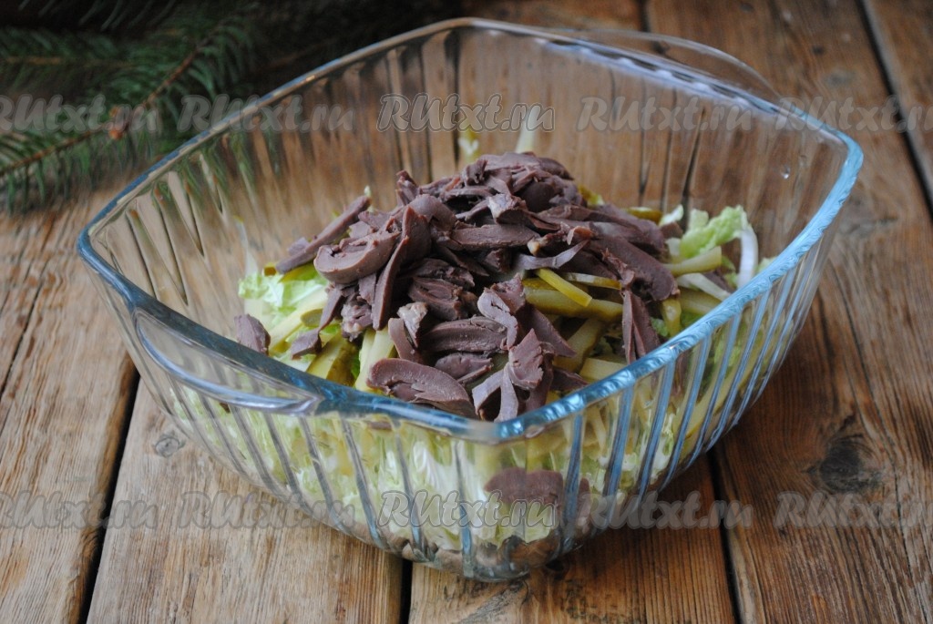 Подготовленные куриные сердечки нарезать соломкой и добавить в салат к соленым огурчикам и пекинской капусте.