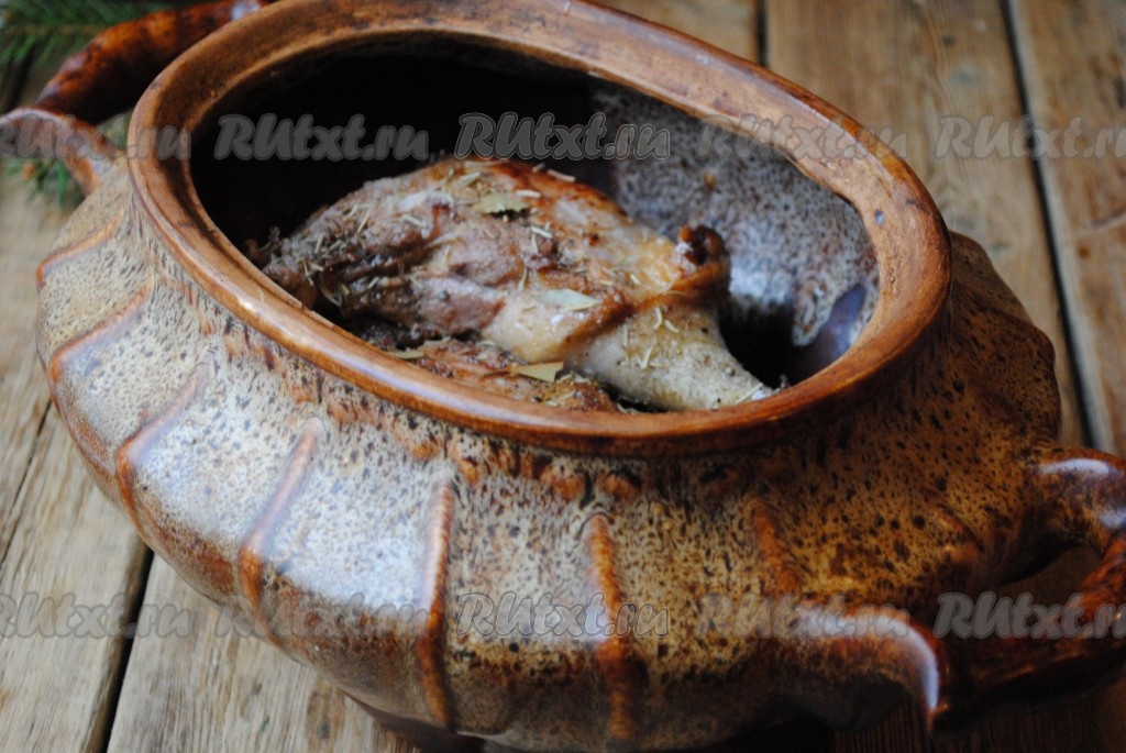 Мясо гуся, приготовленное в горшочке, получается мягким, сочным и очень вкусным, к столу подаём в горячем виде с гарниром.