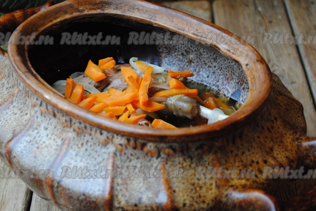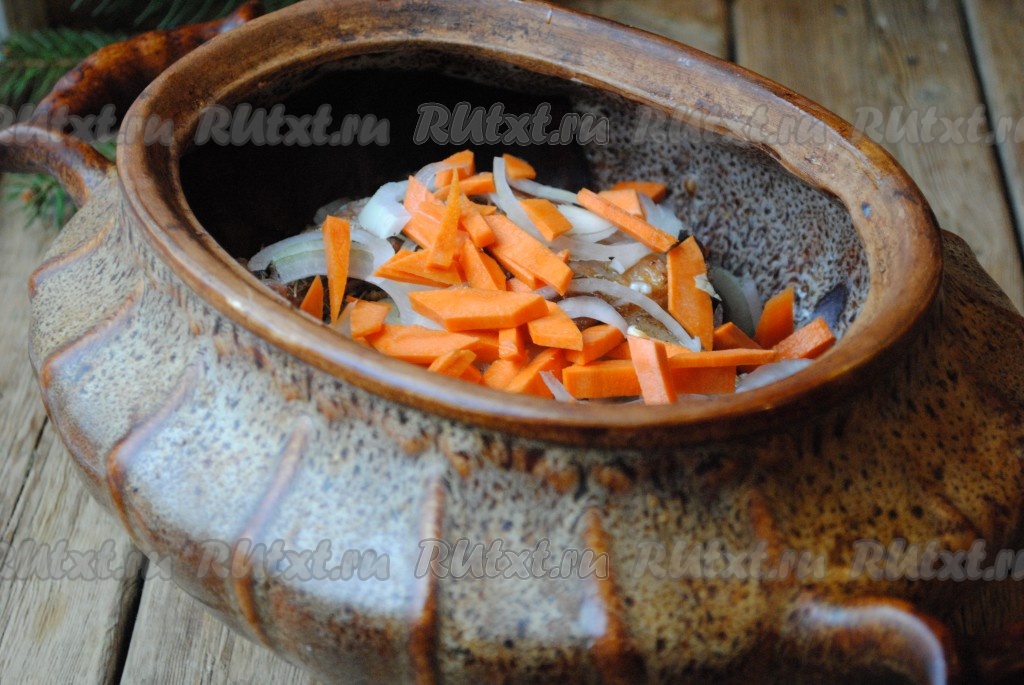 Лук нарезать полукольцами, морковь - соломкой или брусочками, выложить овощи в горшочек поверх гуся.