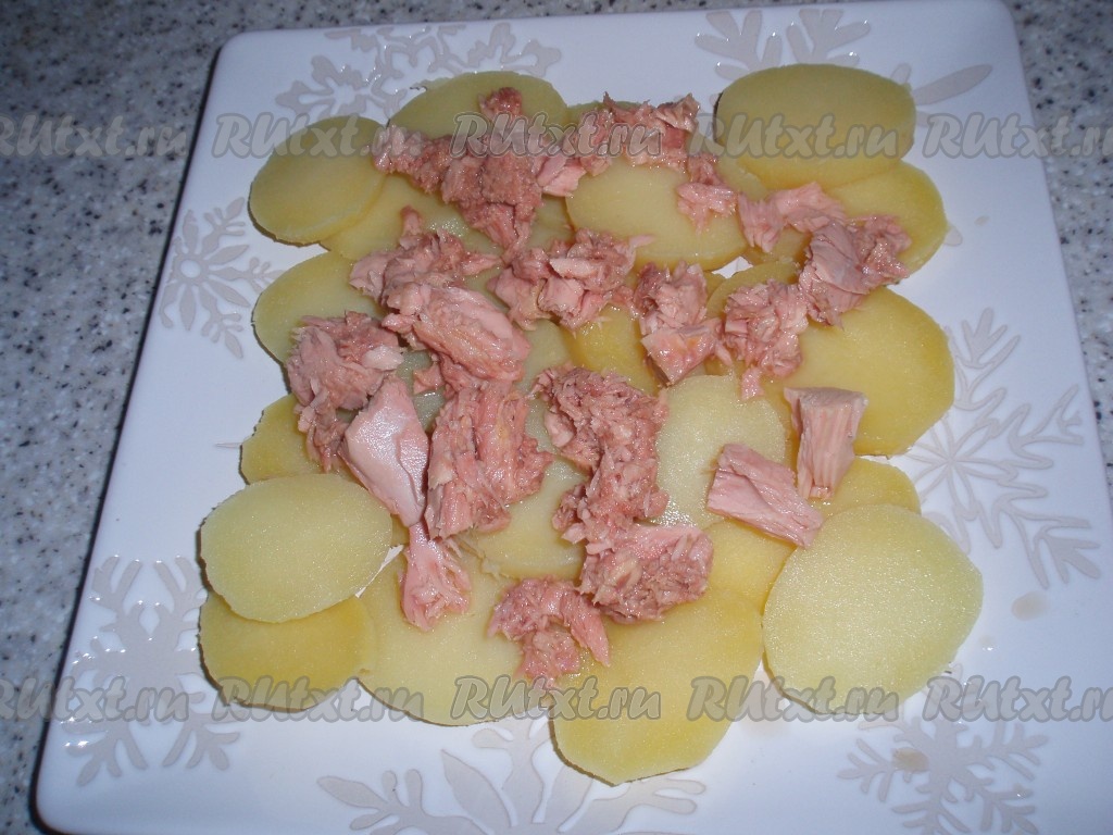 Сверху выложить кусочки консервированного тунца.
