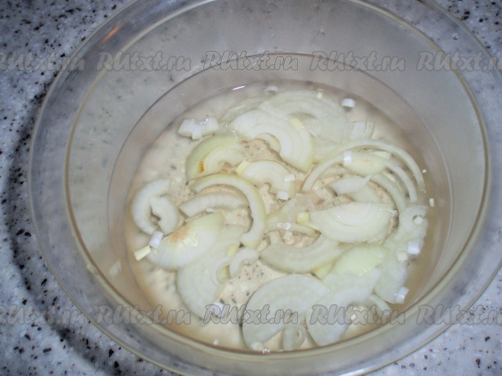 Репчатый лук нарезать тонкими полукольцами и залить на несколько минут кипятком для удаления горечи, затем воду слить.
