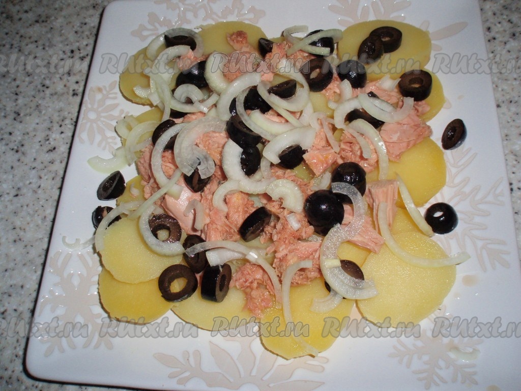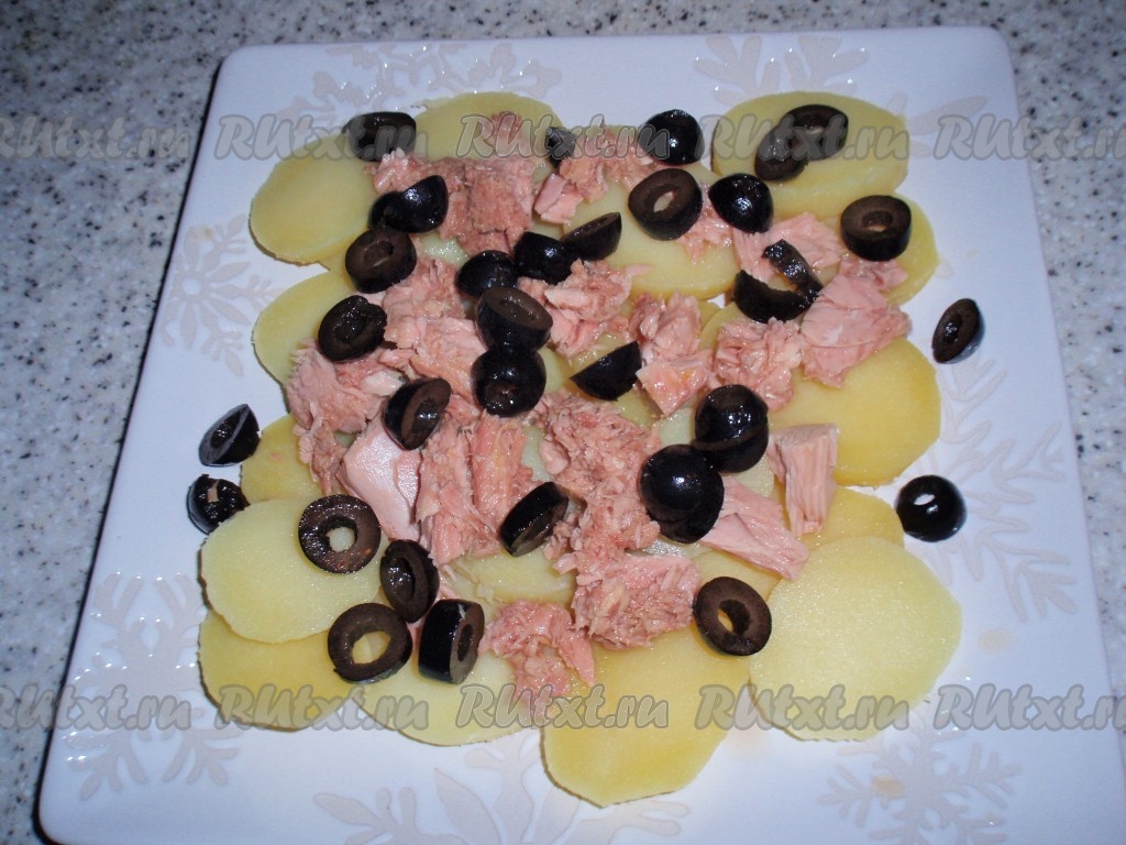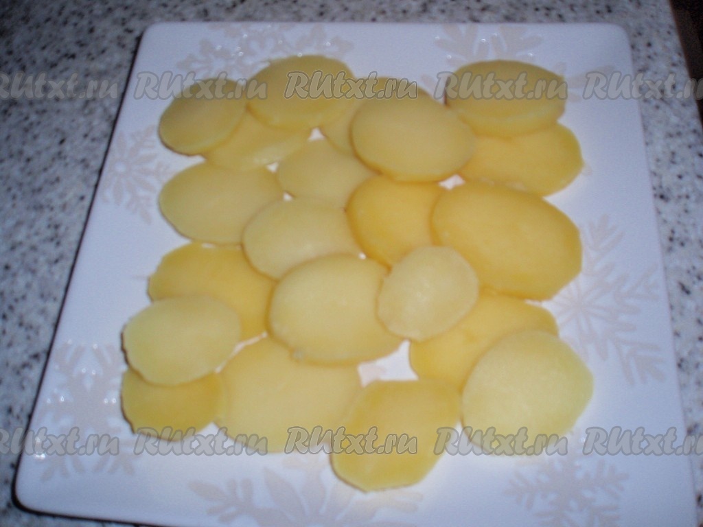 Сваренный в мундире и охлажденный картофель очистить от кожуры и нарезать тонкими пластинками. Выложить картошку на блюдо или на тарелки, если сервируем салат порционно. Слегка посолить.