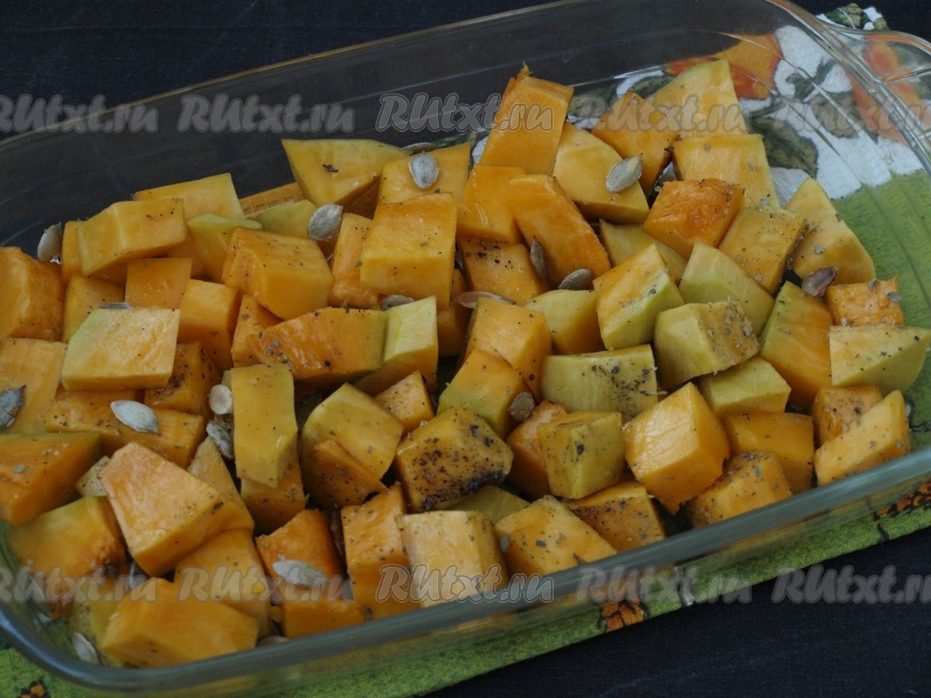 Форму для запекания смазать растительным маслом, выложить тыкву, сбрызнуть немного растительным маслом, поставить в духовку, разогретую до 200 градусов, и запекать минут 25-30 (до готовности тыквы). Для того чтобы проверить готовность, проколите кусочек тыквы ножом, если нож легко входит в тыкву, значит доставайте форму из духовки.