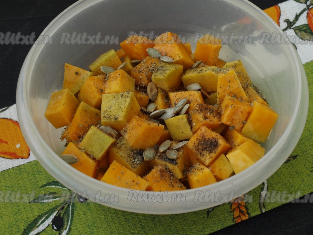 Очищенную тыкву нарезать на средние кубиками, сложить в миску, добавить соль, специи, по желанию, всыпать тыквенные семечки, перемешать.