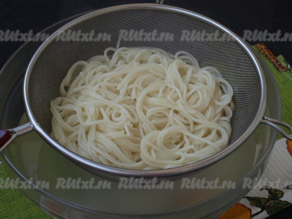 Пока тыква запекается, сварить макароны (у меня - спагетти) до готовности. Для этого сухие макаронные изделия нужно выложить в кастрюлю с кипящей подсоленной водой, перемешать и варить до готовности. Обычно на варку требуется минут 7-9, точное время варки посмотрите на упаковке макарон, которые вы отвариваете. Откинуть варёные макароны на дуршлаг, чтобы с них стекла вода.