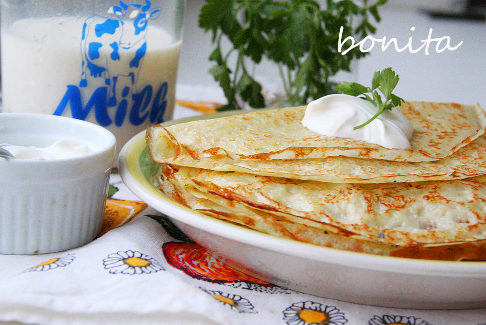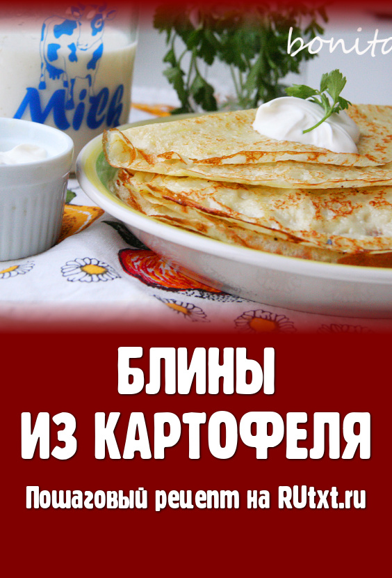 Этим рецептом блинов из картофеля со мной поделилась одна девушка. В ее семье такие картофельные блинчики готовит свекровь. По вкусу блины представляют что-то среднее между обычными блинами и картофельными дерунами. Я думаю, те кто любит деруны, оценят вдвойне это блюдо. Такие блины можно подавать со сметанкой или луковой зажаркой со шкварками.
