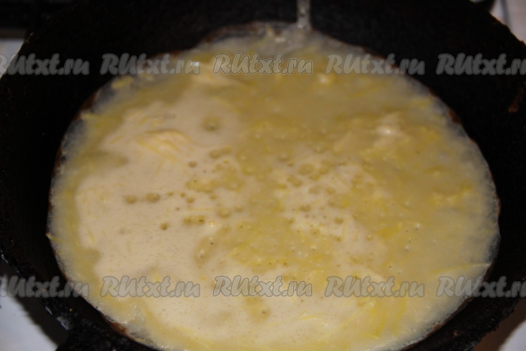 Перемешать всю массу и дать ей отдохнуть в теплом месте около 20 минут. Тесто получается по консистенции, как кефир, - не густое. Разогреть сковороду и смазать ее растительным маслом. Вылить примерно один половник теста на сковороду, равномерно распределить и жарить блин на среднем огне с двух сторон. Картофельные блины по этому рецепту получаются не тонкими, а толстенькими и в дырочку (хотя толщину блинчиков можно регулировать по своему вкусу, наливая на сковороду большее или меньшее количество теста).