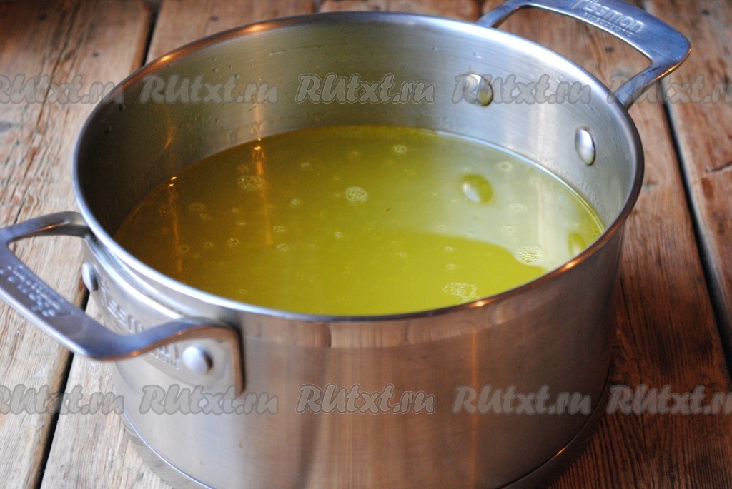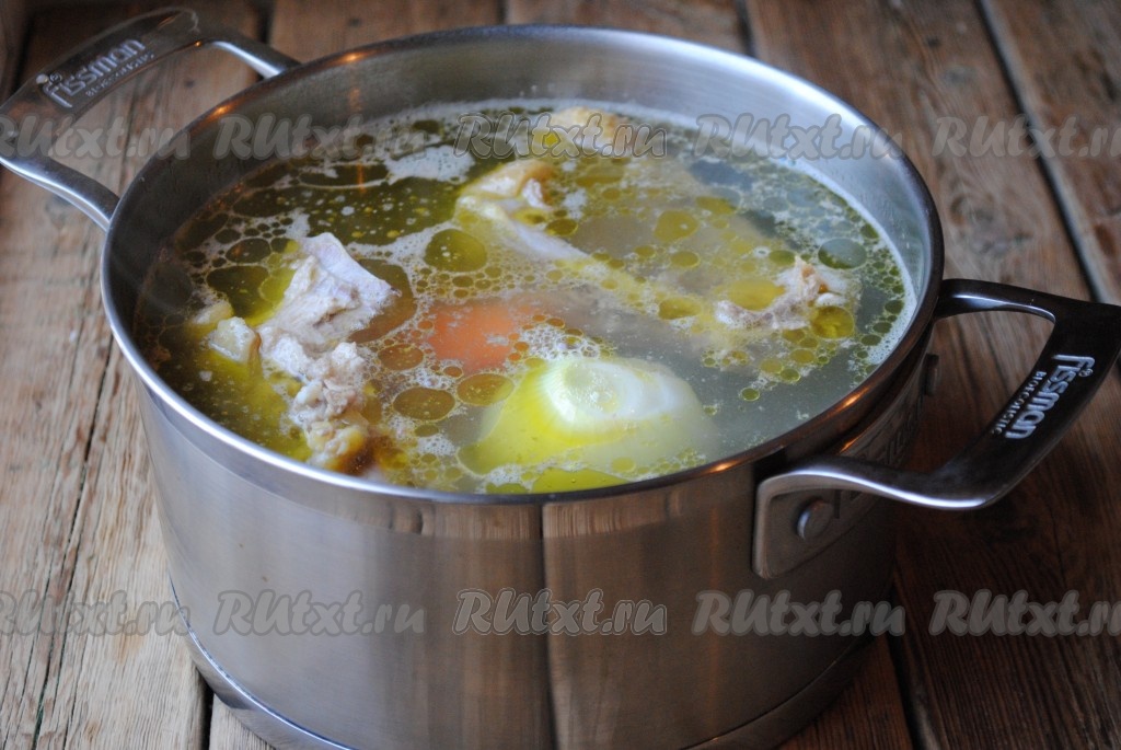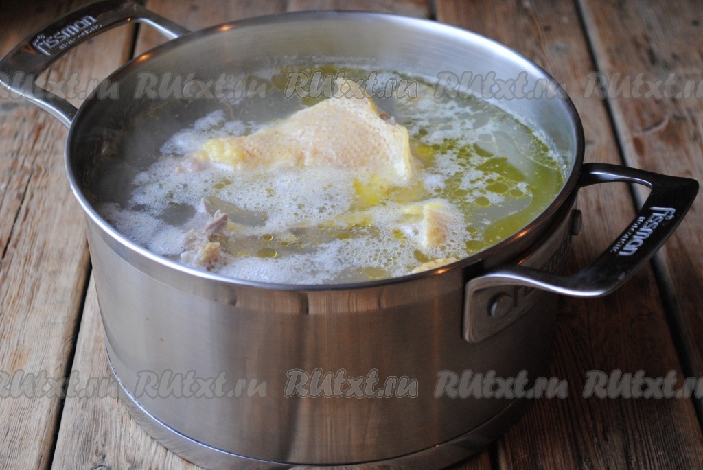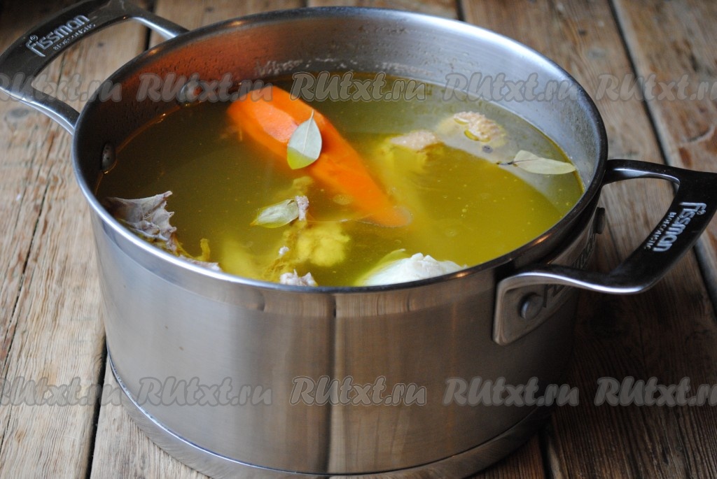 Довести до кипения. Снять образовавшуюся пену и уменьшить огонь. Основной секрет прозрачности бульона заключается в том, что вариться он должен при минимальном кипении.