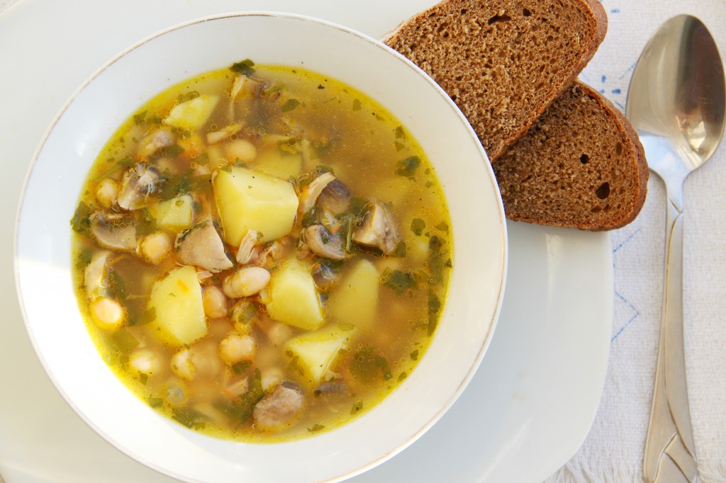 Добавить мелко нарезанную зелень, соль и перец по вкусу, довести до кипения и выключить огонь. Аппетитный, сытный, вкусный фасолевый суп с грибами готов, можно звать близких снимать пробу.