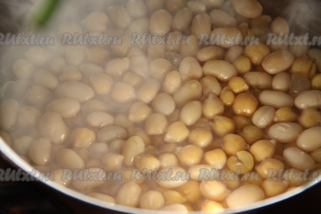 Нут и фасоль замочить на ночь в холодной воде. Утром залить фасоль и нут чистой водой и отварить до готовности. Время приготовления зависит от сорта фасоли, мне понадобилось 20 минут.
