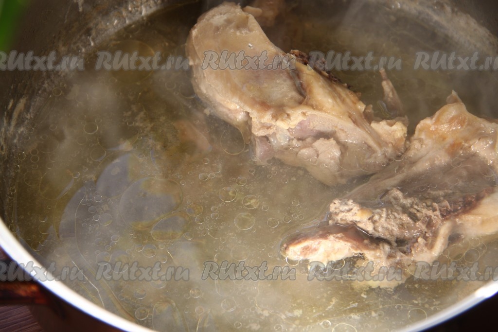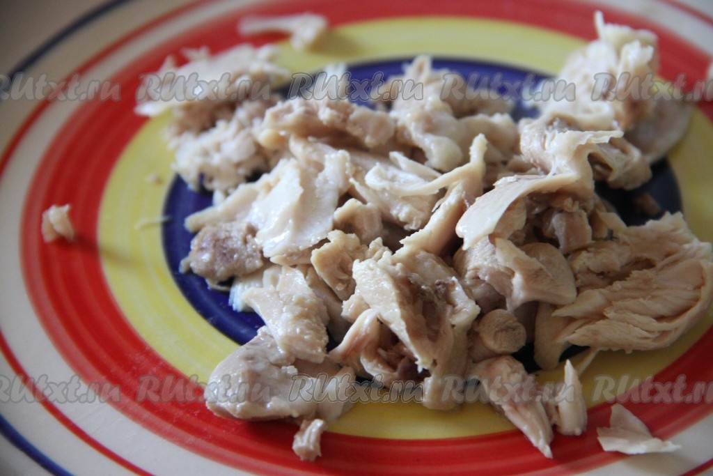 Затем бульон процедить, мясо разобрать на кусочки.
