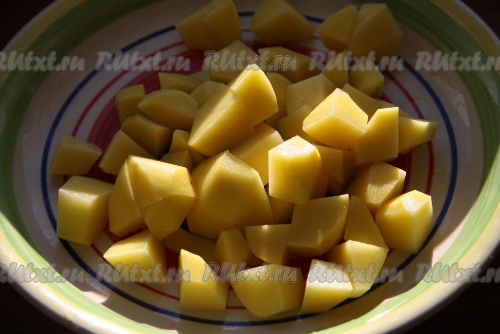 В бульон с мясом выложить сварившиеся нут и фасоль, добавить немного воды, в которой варились нут с фасолью. Очищенный картофель нарезать кубиками и выложить в суп, поставить на огонь и варить на небольшом огне до готовности картошки.