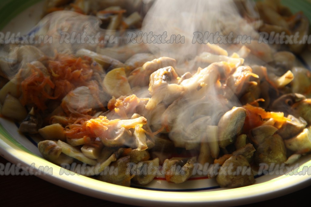 Отдельно на сковороде на растительном масле обжарить мелко рубленный лук, натертую морковь и измельченные грибы в течение 5-7 минут, периодически помешивая. Если используете сушеные грибы, то их надо предварительно замочить в воде. Когда картошка сварится, выложить обжаренные грибы с овощами в кастрюлю с фасолевым супом и варить еще 5 минут.