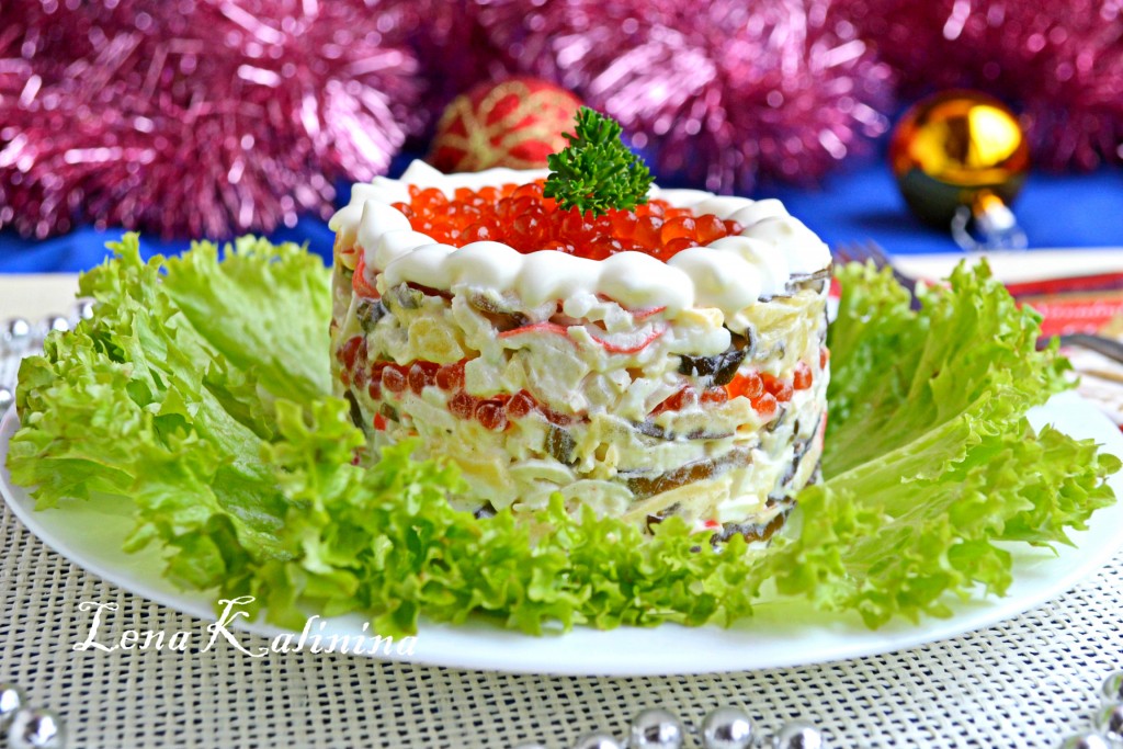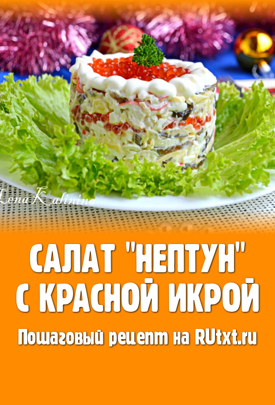Хочу предложить вам рецепт салата "Нептун" с красной икрой. Этот салатик украсит своим ярким видом новогодний и любой другой праздничный стол. Салат очень вкусный, его можно приготовить порционно, выкладывая на тарелку с помощью кулинарного кольца, а можно - и в салатнике. Попробуйте, отличный салатик!
