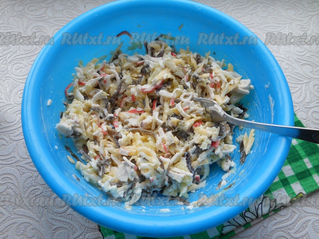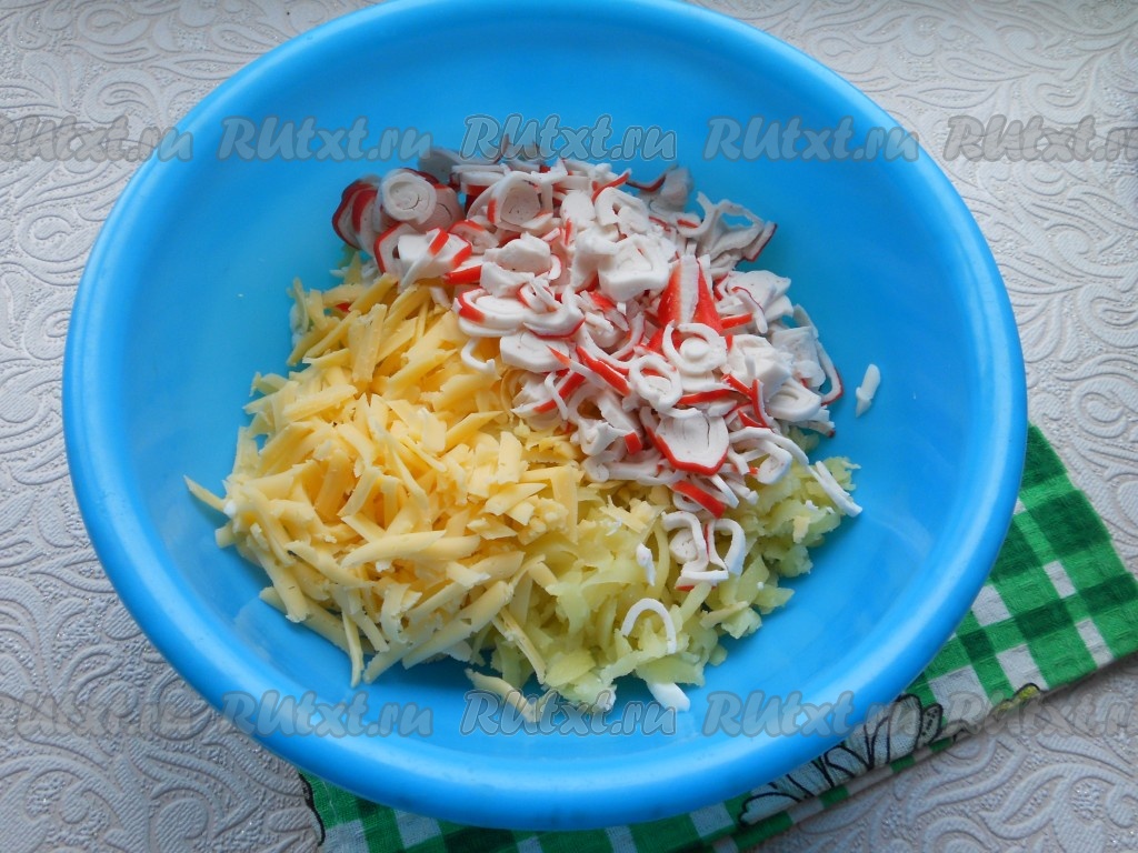 Добавить натертый на крупной терке твердый сыр и нарезанные тонкими кружочками крабовые палочки.