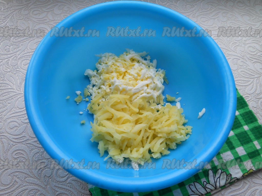 Я готовила салат порционно (2 порции). Картофель и яйца очистить, натереть на крупной терке.