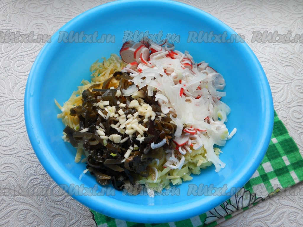Капусту морскую порубить немного и добавить в салат. Сюда же добавить измельченный чеснок. Репчатый лук нарезать тонкими полукольцами, залить на 5 минут кипятком, а затем отжать и тоже добавить в салат.