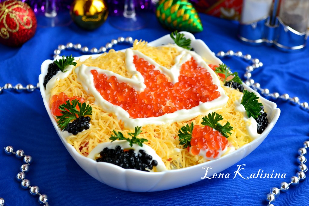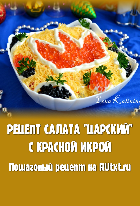 Хочу поделиться рецептом вкусного, яркого, красивого салата "Царский" с красной икрой. Это блюдо несомненно украсит праздничный стол. Салат готовится слоями, украшается красной и черной икрой и смотрится на столе шикарно. Попробуйте, салатик понравится и Вам, и Вашим родным, и гостям.