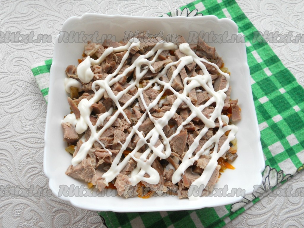 Отварную говядину нарезать кусочками и выложить следующим слоем + майонез.