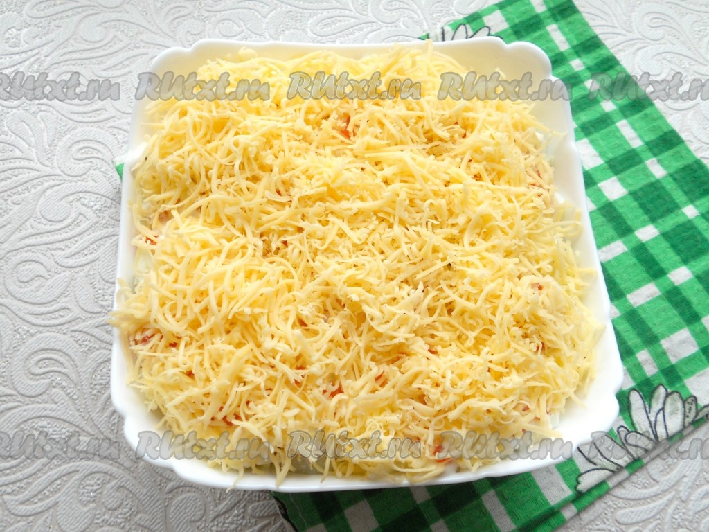 Последним слоем выложить натертый на мелкой терке твердый сыр.