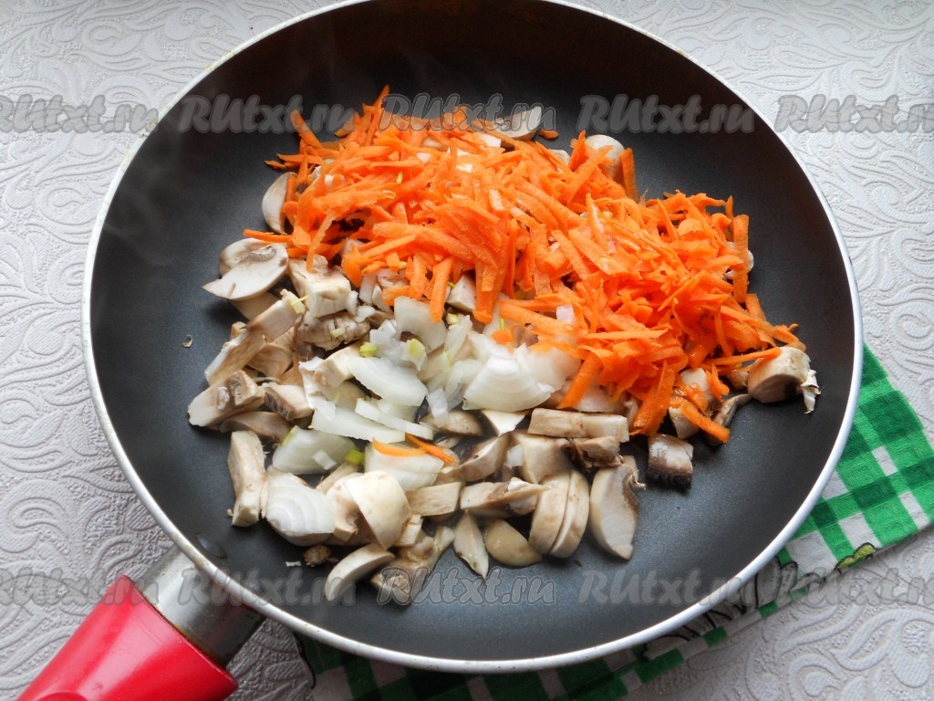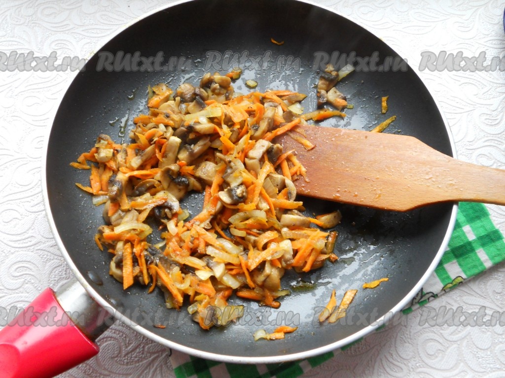 Лук, шампиньоны и морковь немного посолить и поперчить. Обжарить все в течение 4-5 минут, перемешивая, затем остудить.