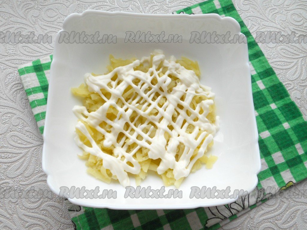 Отварной картофель очистить и натереть на крупной терке, выложить картофель первым слоем в салатник + майонез.
