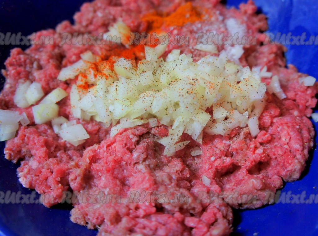 К фаршу добавить мелко нарезанный репчатый лук (используйте 1/3 от головки лука), соль, специи. Тщательно вымесить фарш.