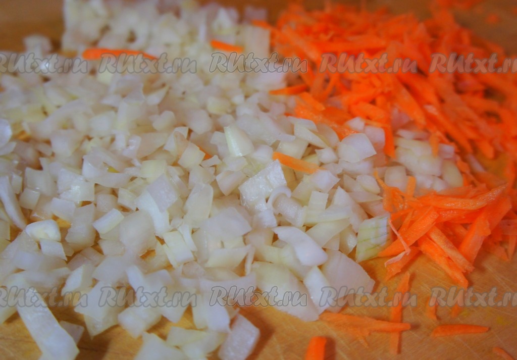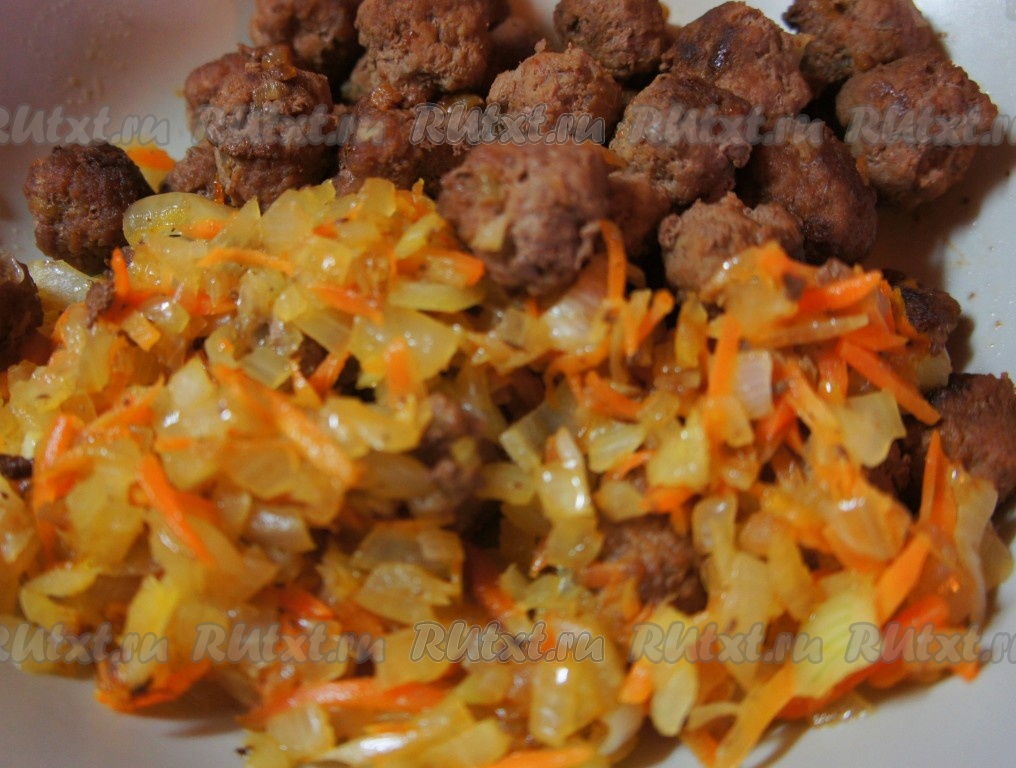 Оставшийся лук мелко нарезать, морковь натереть на тёрке, обжарить овощи, помешивая,  на скороде, в которой жарили фрикадельки. Ориентировочно 3-4 минуты.