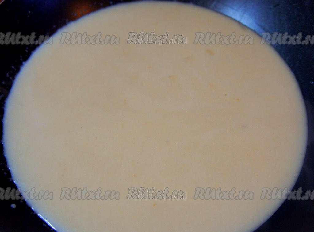 На сухую сковороду добавить муку, поджарить без добавления масла при постоянном помешивании, до тех пор пока мука не станет немного темнее. Добавить сливочное масло. Перемешать. Влить сливки, перемешать. Дать потушиться сливочному соусу 2 минуты.