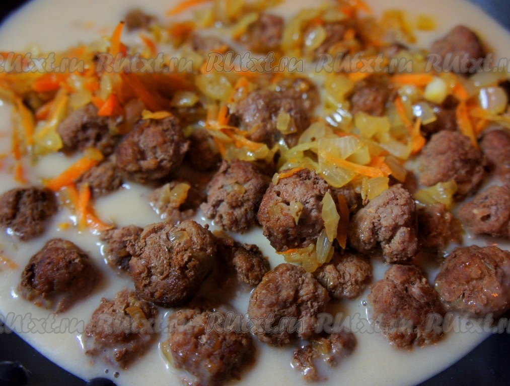 Добавить в сливочный соус фрикадельки, овощи, молоко, соль. Перемешать. Тушить на медленном огне в течение 15 минут. Периодически перемешивайте, иначе может подгореть!
