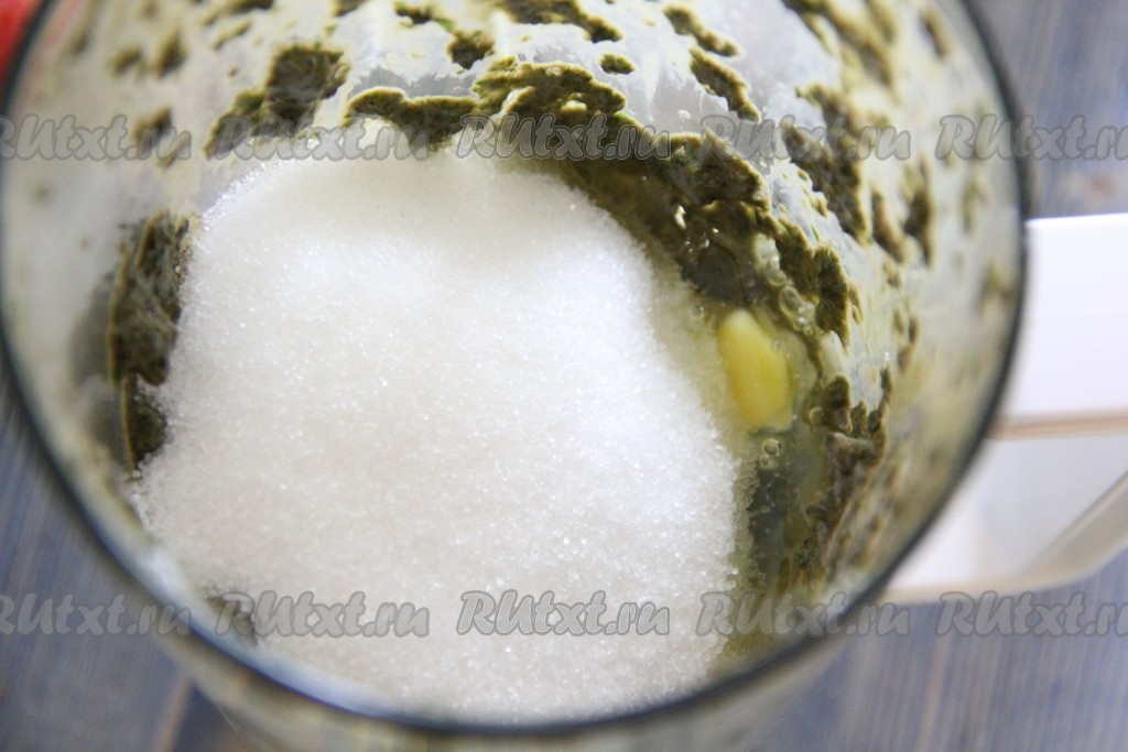 К измельченной мяте всыпать сахар и добавить оставшиеся яйца, хорошо взбить.