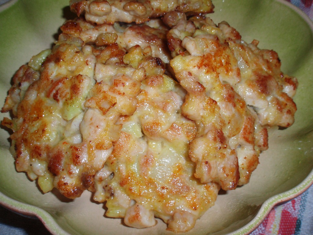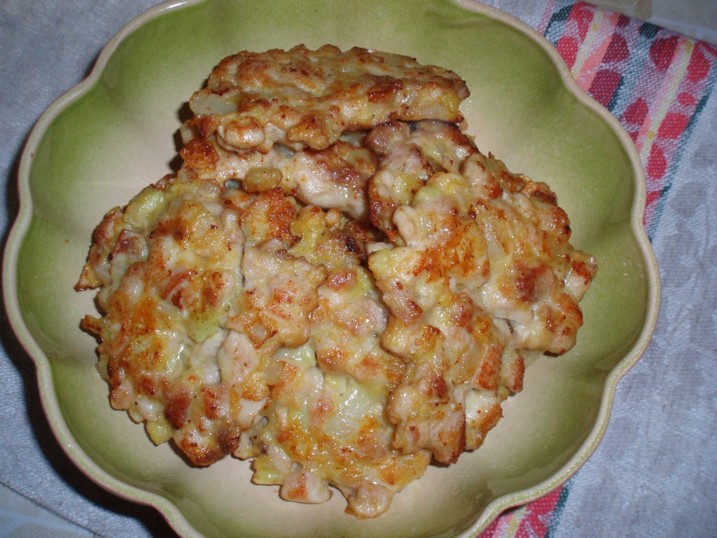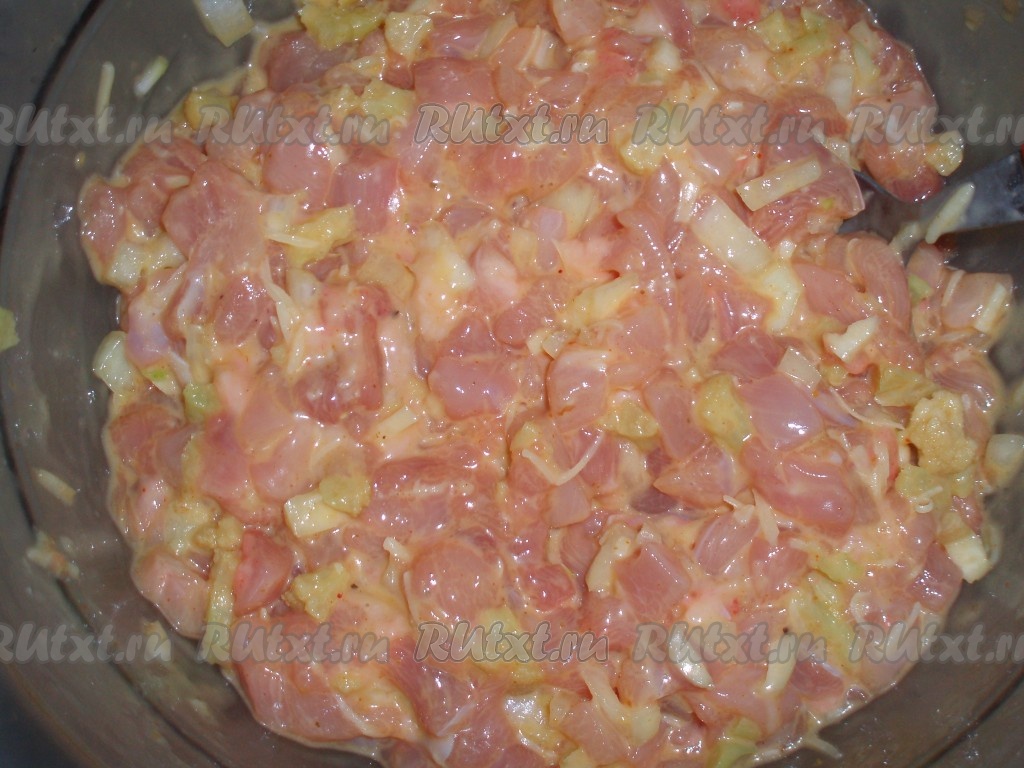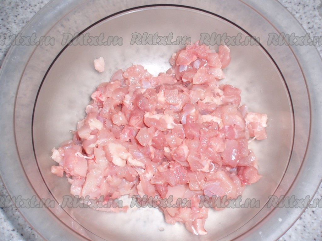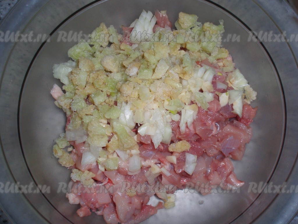Луковицу измельчить, чеснок пропустить через пресс, добавить к нарезанному куриному мясу. Туда же добавить мелко нарезанную цветную капусту (замороженную предварительно разморозить).