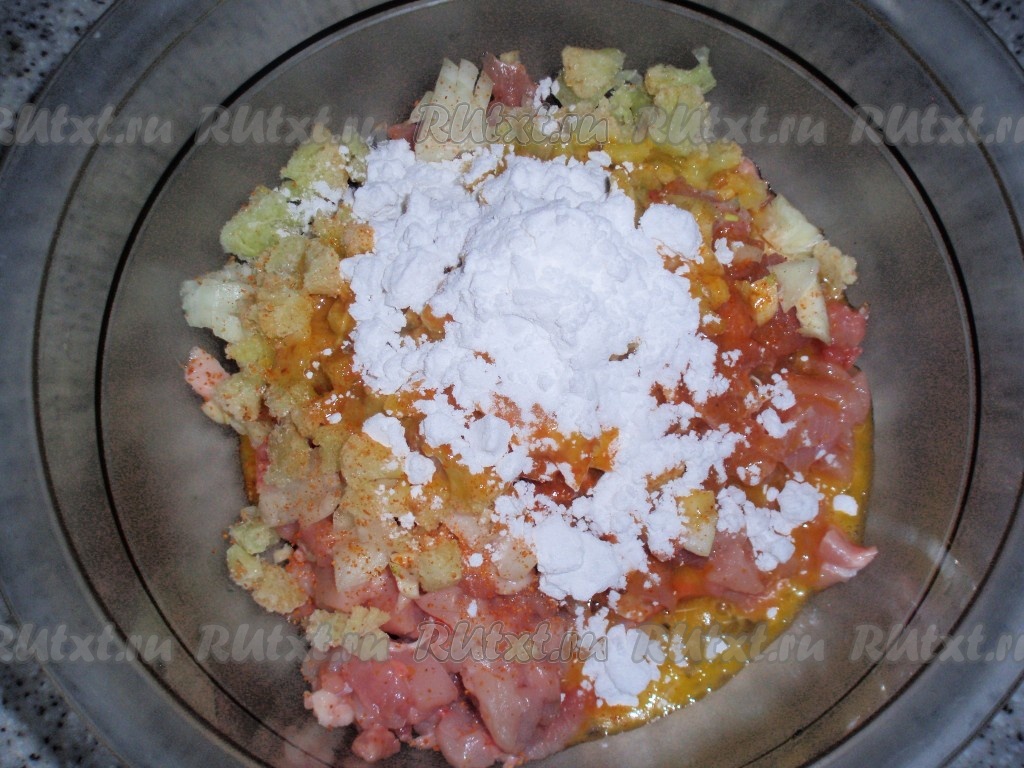Добавить яйцо, крахмал, соль, специи по вкусу.