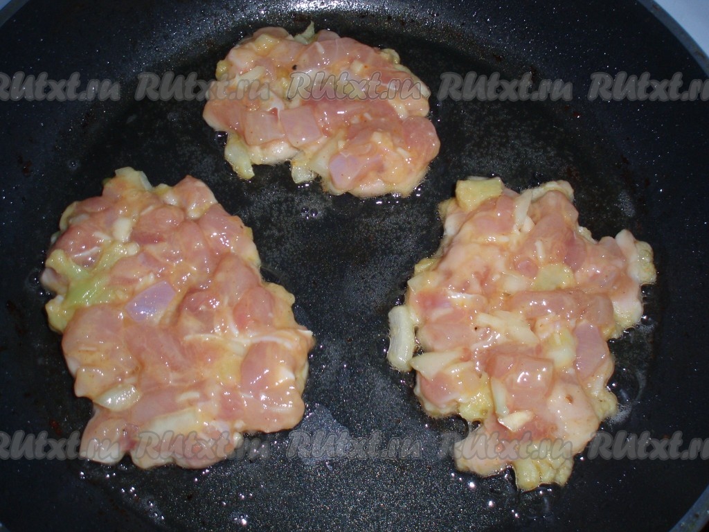 На сковороде раскалить растительное масло. Ложкой выкладывать фарш и обжарить рубленные куриные котлеты с двух сторон до румяной корочки. Затем уменьшить огонь, прикрыть сковороду крышкой и довести котлеты до готовности.