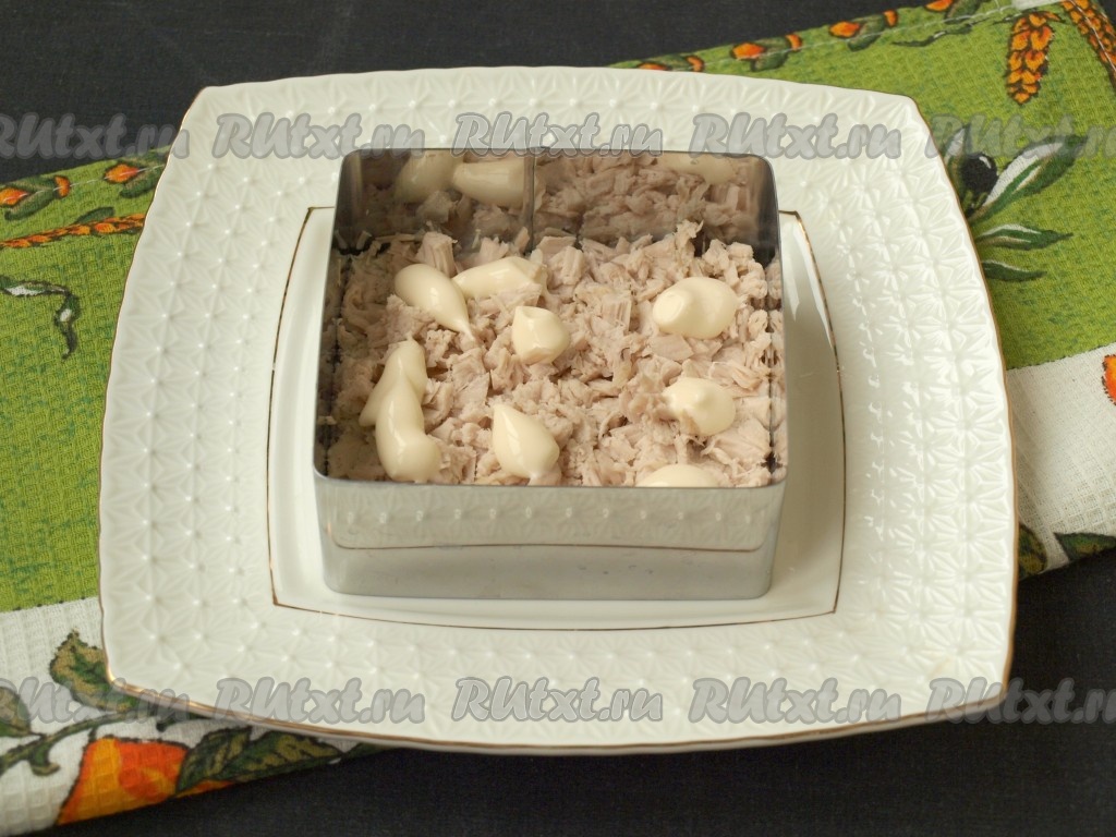 Нарезать корейскую морковку на достаточно короткие полоски, выложить следующим слоем, немного смазать майонезом.